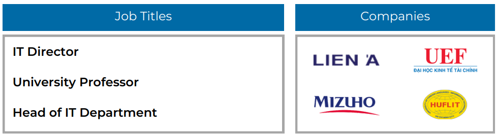 Ngân hàng, Bảo hiểm, Tài chính tiêu dùng, Hàng tiêu dùng & Bán lẻ, Sản xuất, Sản xuất may mặc, Sản xuất giày dép, Làm đẹp & Mỹ phẩm, Dược, Nghiên cứu thị trường, Nhập khẩu & Xuất khẩu, Dịch vụ tiếp thị, Công nghệ cao & Thương mại điện tử, Trò chơi.